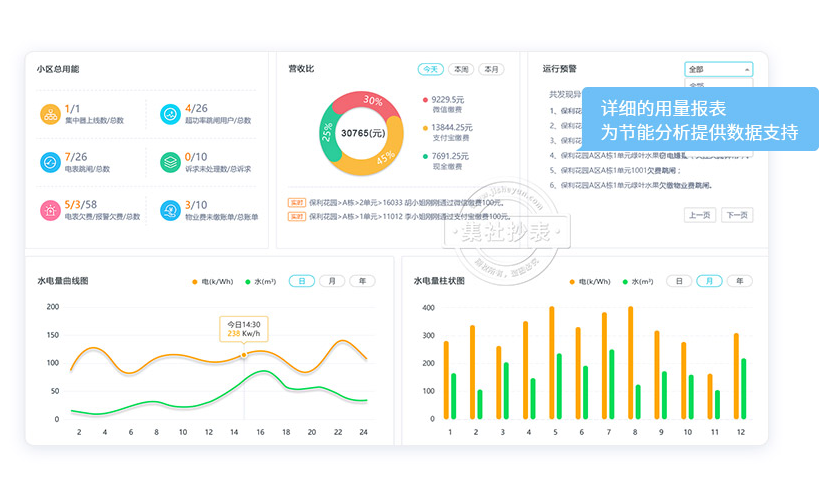 集社智能水电表管理系统不仅可以实现“先交费、后用电”,可支持数据统计、超功率限额、欠费提醒、智能防窃电等功能,缓解企业水电运营的资金压力,提高水电管理效率。