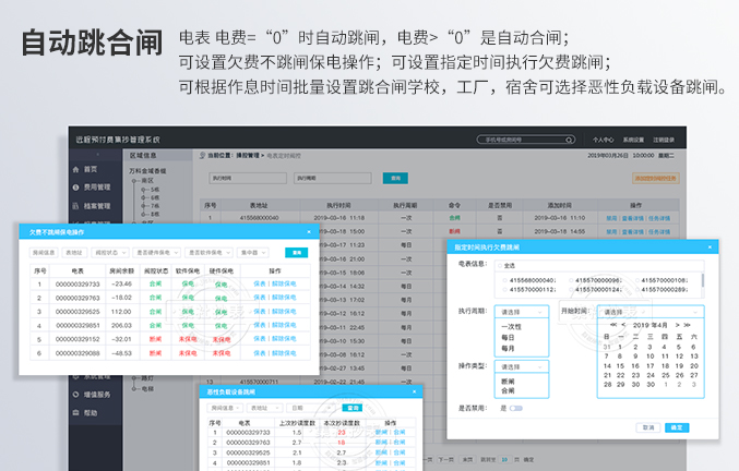 1. 远程定时开合闸:可根据学校的管理需求,灵活选择指定的宿舍楼,设置固定和闸、断闸时间。预付费系统将每日定时自动开合闸,规范学校的用电管理,也大大节约了学校的管理成本。