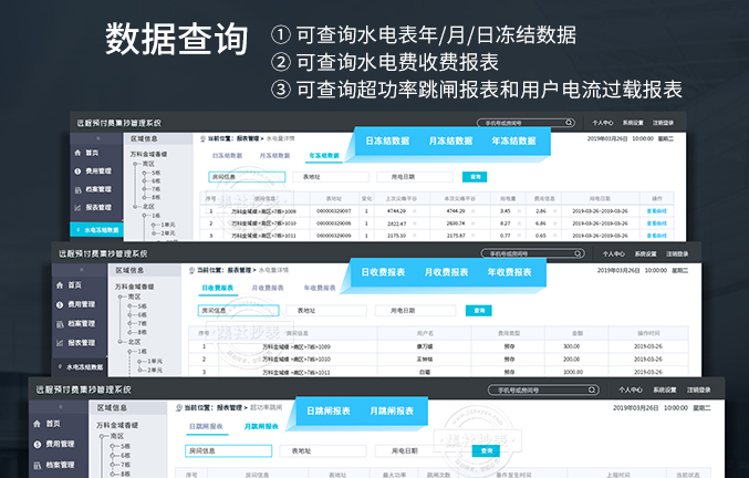 2. 系统远程抄表、多维度报表分析:学校可以通过系统远程抄表,随时抄读学生公寓电表的当前数据;系统还可以自动采集数据,形成冻结数据报表。既快速又准确。