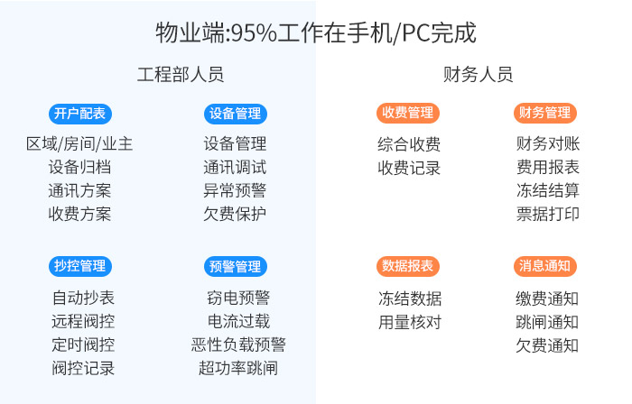 功能丰富,具有查询缴费、短信通知、远程开合闸、数据统计、智能防窃电、恶性负载识别、阶梯计价、电费补助、设备故障及时预警、系统维护修复等多种功能,能够有效地满足电力公司或物业管理部门对电表远程控制的需求。