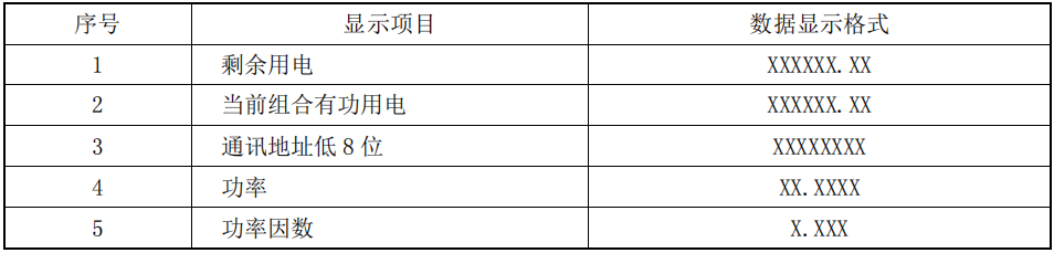 第三种:直接通过预付费电表的液晶大显示屏查看数据,通过汉字显示的方式,清晰可见剩余电量多少,一般采用循环显示的形式,显示数据停留一定时间(该时间可设置)后,自动切换到下一屏的显示,具体显示格式如下图所示: